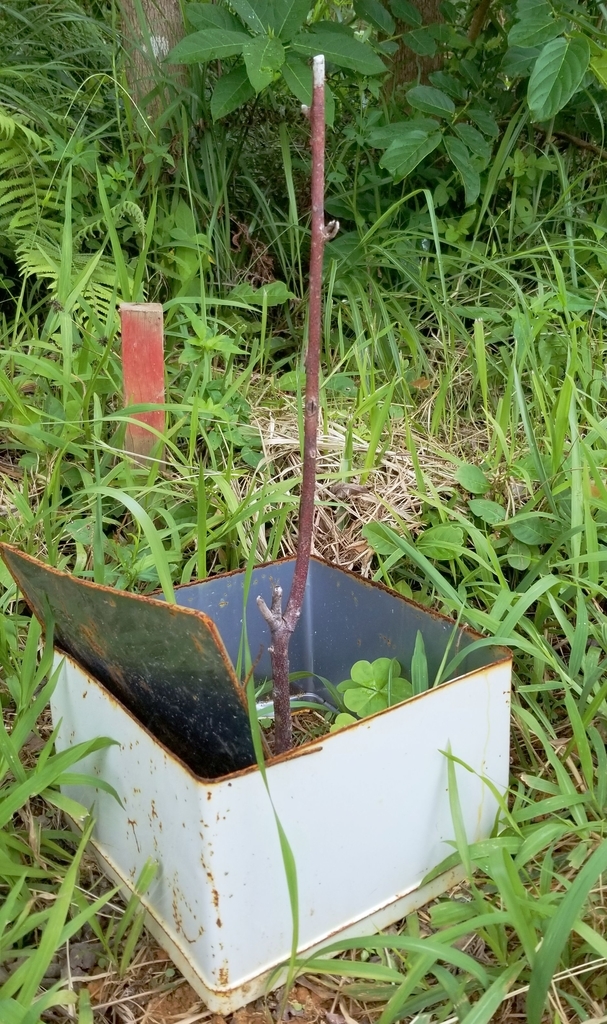 間違って草刈り機で刈ってしまわないように、缶を切ったもので囲いました。